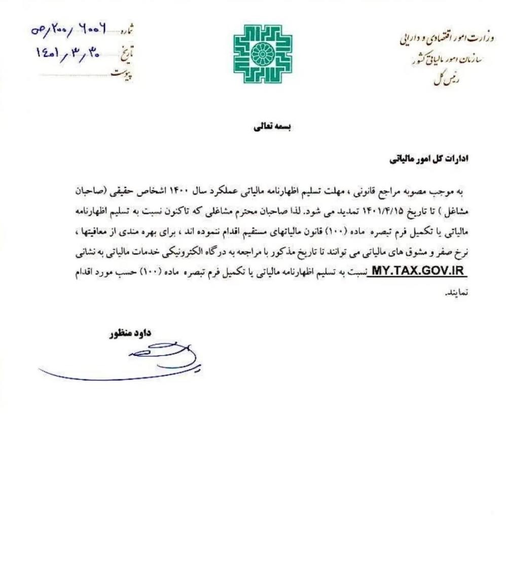 تمدید مهلت تسلیم اظهارنامه مالیاتی عملکرد سال 1400 اشخاص حقیقی (صاحبان مشاغل)