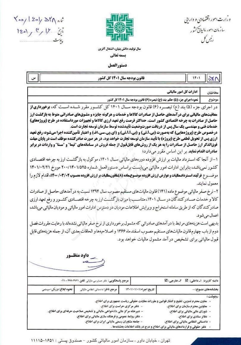 دستورالعمل نحوه اجرای جزء ۵ حکم بند(ع)تبصره 6 قانون بودجه سال 1401