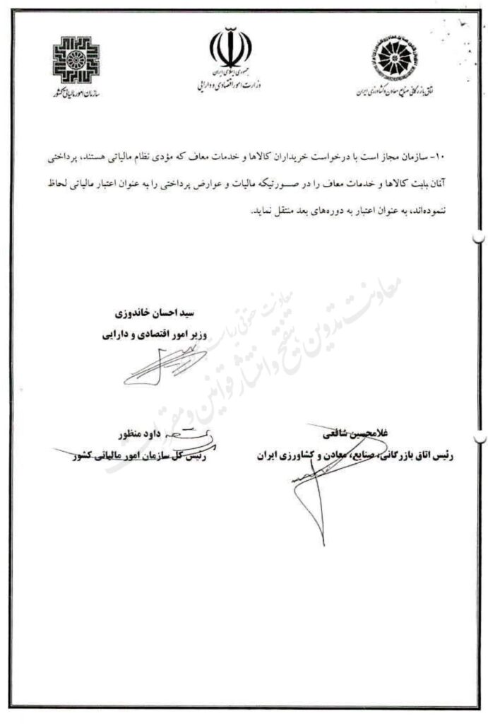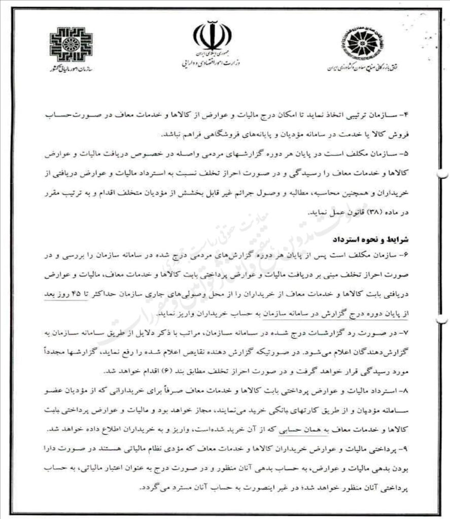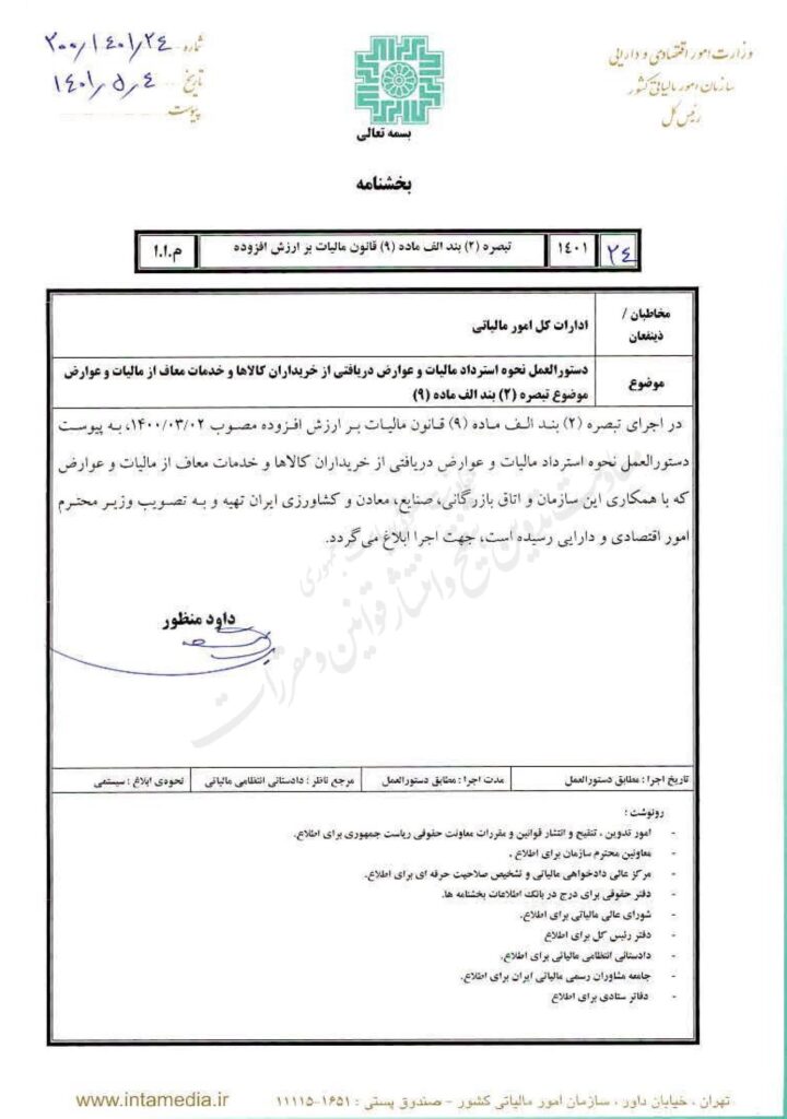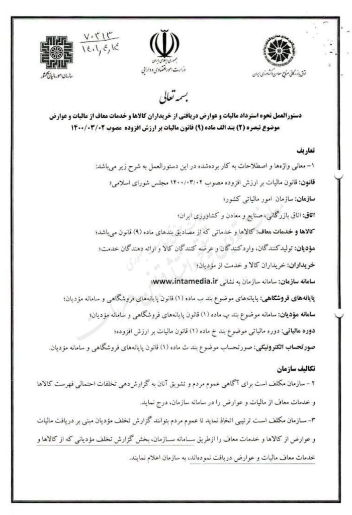 دستورالعمل نحوه استرداد مالیات و عوارض خریداران کالاها و خدمات معاف از مالیات و عوارض موضوع تبصره 2 بند الف ماده ۹
