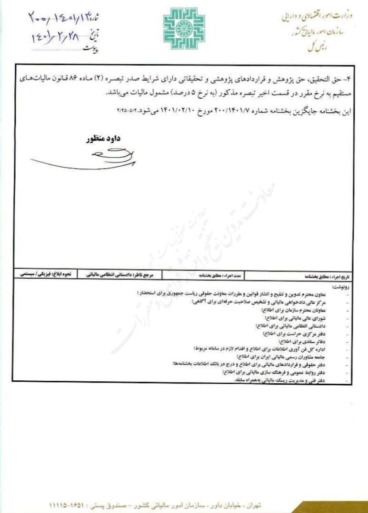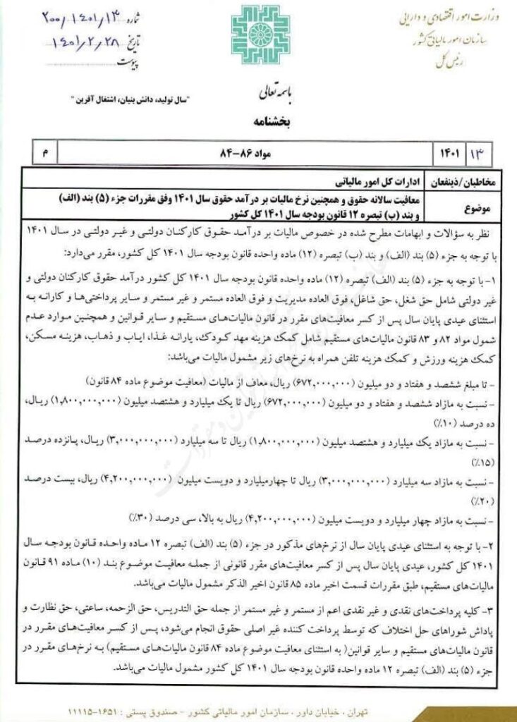 معافیت و نرخ مالیات سالانه حقوق در سال 1401(جایگزین بخشنامه شماره ۷/1401/200 مورخ 10/02/1401)